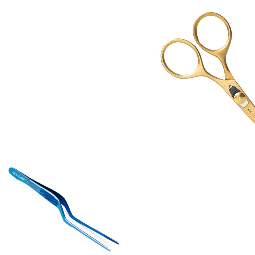 Expert chef using Oui Chef straight tweezers to plate a dish OuiChef_Precision_Kitchen_Tools_for_chefs
